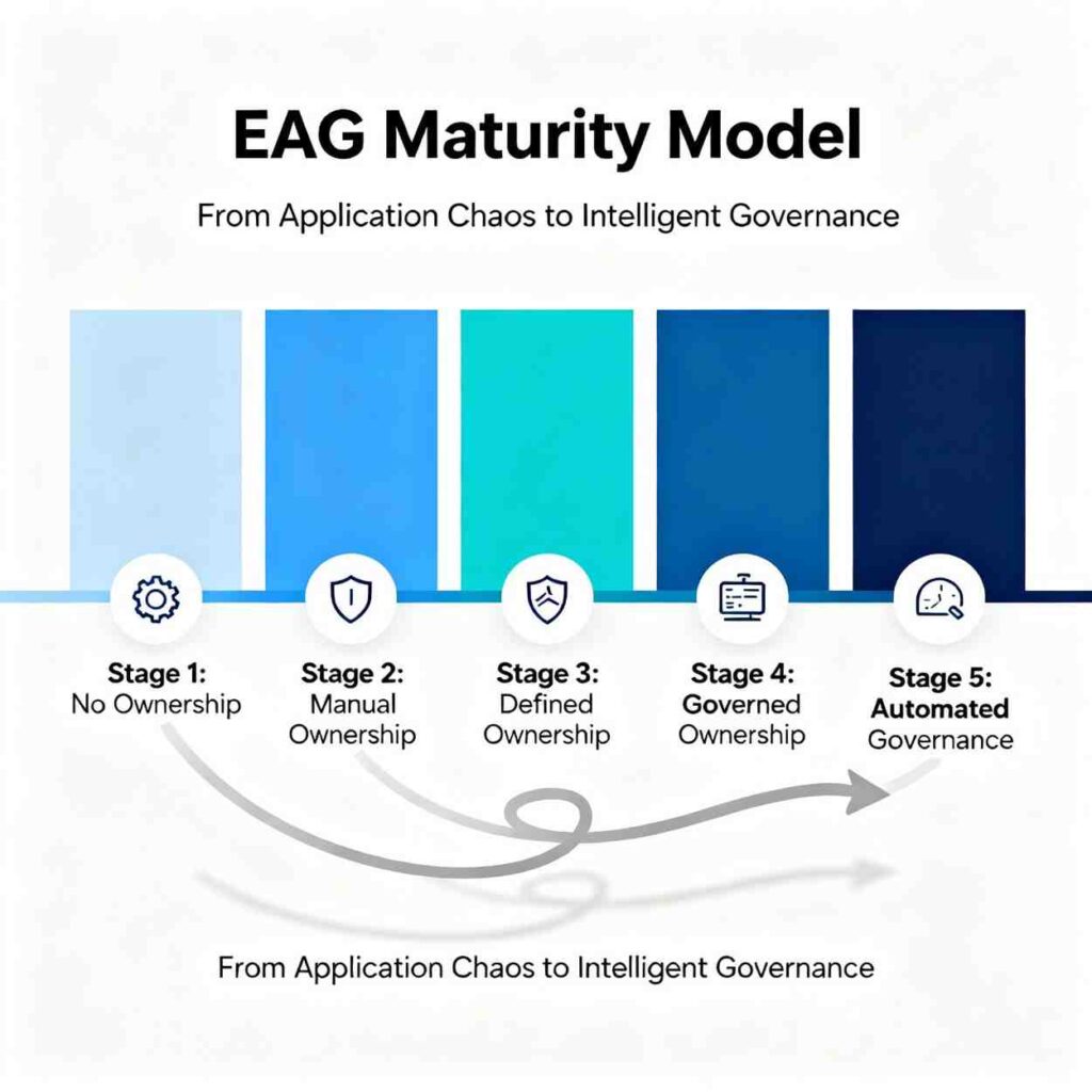 The EAG Maturity Model provides a strategic roadmap for organizations to measure and improve their governance posture across five distinct stages. Each stage represents a level of sophistication in managing application ownership, visibility, and automation.